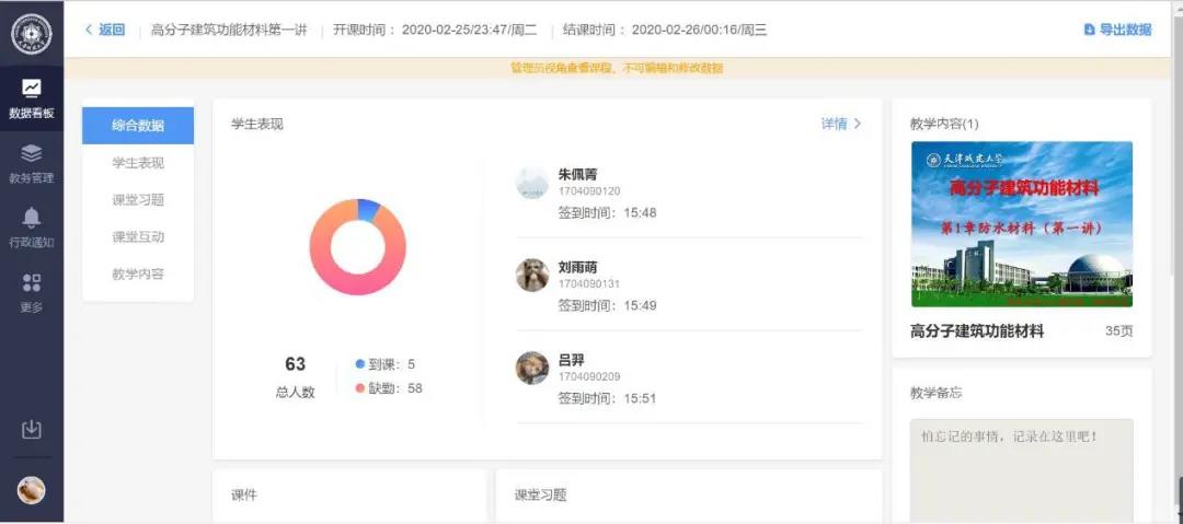 开课第一天,公司教师使用各类平台共完成本科生7门次课程的授课任务,参与学习的本科生394人次,员工出勤率100%。在进行网络授课时,任课教师加强与员工们的有效互动,效果较好。公司领导班子积极深入课堂进行督导,及时发现问题,保障教学秩序平稳运行。