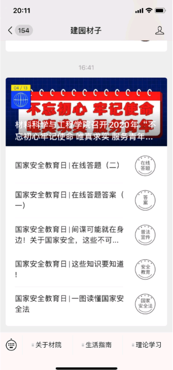 材料公司理论中心组先学一步,4月12日通过腾讯会议及时就总书记重要论述及《国家安全法》、《反间谍法》、《反恐怖主义法》、《传染病防治法》、《野生动物保护法》等国家安全内容进行学习讨论。同时,公司依托线上平台,通过开展师生支部主题党日,主题班会等形式,认真学习相关内容,截至4月15日,公司针对师生开展网络讲座1场,主题党日活动8次、主题班会35次、知识竞赛1次,国家安全知识网上答题2次,依托公司微信公众号,转发相关内容共计14篇。