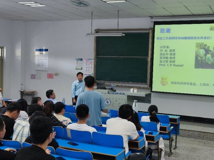 姜学松教授以“高分子表面动态褶皱图案”为主题,深入浅出地向与会师生介绍了智能高分子表面中动态微纳米图案设计制备,表面性能动态调控和动态图案在光栅、防伪等智能光学材料方面的应用。姜教授详细讲解了其提出的基于动态化学构建动态表面微纳米图案的新策略,并介绍了在此基础上构建的一系列具有温度、pH、可见光和红外光响应性的多级次图案化表面。在实际应用方面,提出利用动态表面褶皱图案构建3D动态指纹的策略,探索了动态表面褶皱图案在智能光学材料如动态光栅、防伪等领域的应用。