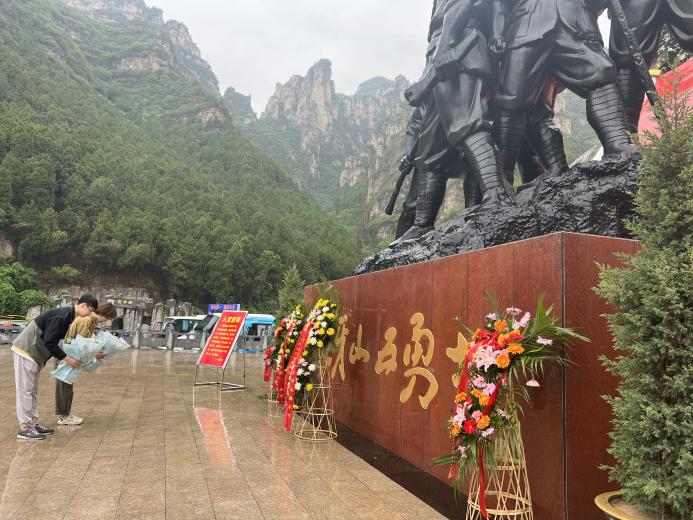 “巍巍燕山高,潇潇易水寒。英雄五壮士,威震狼牙山”。在狼牙山脚下巍然耸立的五勇士雕像前,教师代表们怀着无比沉重的心情和最崇高的敬意向五勇士雕像敬赠鲜花,并行鞠躬礼,以表达对革命先烈的沉痛悼念和深切缅怀。