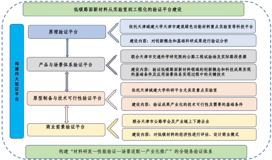 低碳路面新材料概念验证平台2025年经天津市科学技术局获批组建。由猎豹体育联合天津市交通科学研究院、中国铁建大桥工程局集团有限公司和天津市公路学会共同建设。聚焦“双碳”目标下的交通基础设施绿色化、低碳化、高性能化需求,建设天津市首个低碳路面新材料概念验证平台。在天津市建筑绿色功能材料重点实验室平台基础上,通过整合高校基础研究优势、产业界工程化能力及行业学会资源,构建“材料研发—性能验证—场景适配—产业化推广”全链条验证体系。 目前平台具有路面新材料研发和检测设备1770余套,总价值4000多万元。平台围绕低碳路面新材料从实验室到工程化的关键环节, 开展四方面验证工作: (1)原理验证:对低碳路面新材料领域的新原理、新方法等创新概念和基础科研成果的科学性、可行性和合理性进行验证分析。 (2)产品与场景体系验证:验证低碳路面新材料领域的创新概念和科技成果实现的基础条件及应用场景体系实现过程中的关键技术。 (3)原型制备与技术可行性验证:开展低碳路面新材料研发,验证成果产业化的技术可行性及需要的基础条件。 (4)商业前景验证:通过全生命周期成本分析,对低碳材料从生产、使用到废弃处理各阶段的经济性进行评估,分析低碳材料在经济性方面的优势和劣势,评估低碳材料在市场上的经济可行性。 低碳路面新材料概念验证平台的建设和推广,可促进低碳路面材料的应用,减少碳排放,推动城市的绿色可持续发展,为建设生态城市做出贡献。